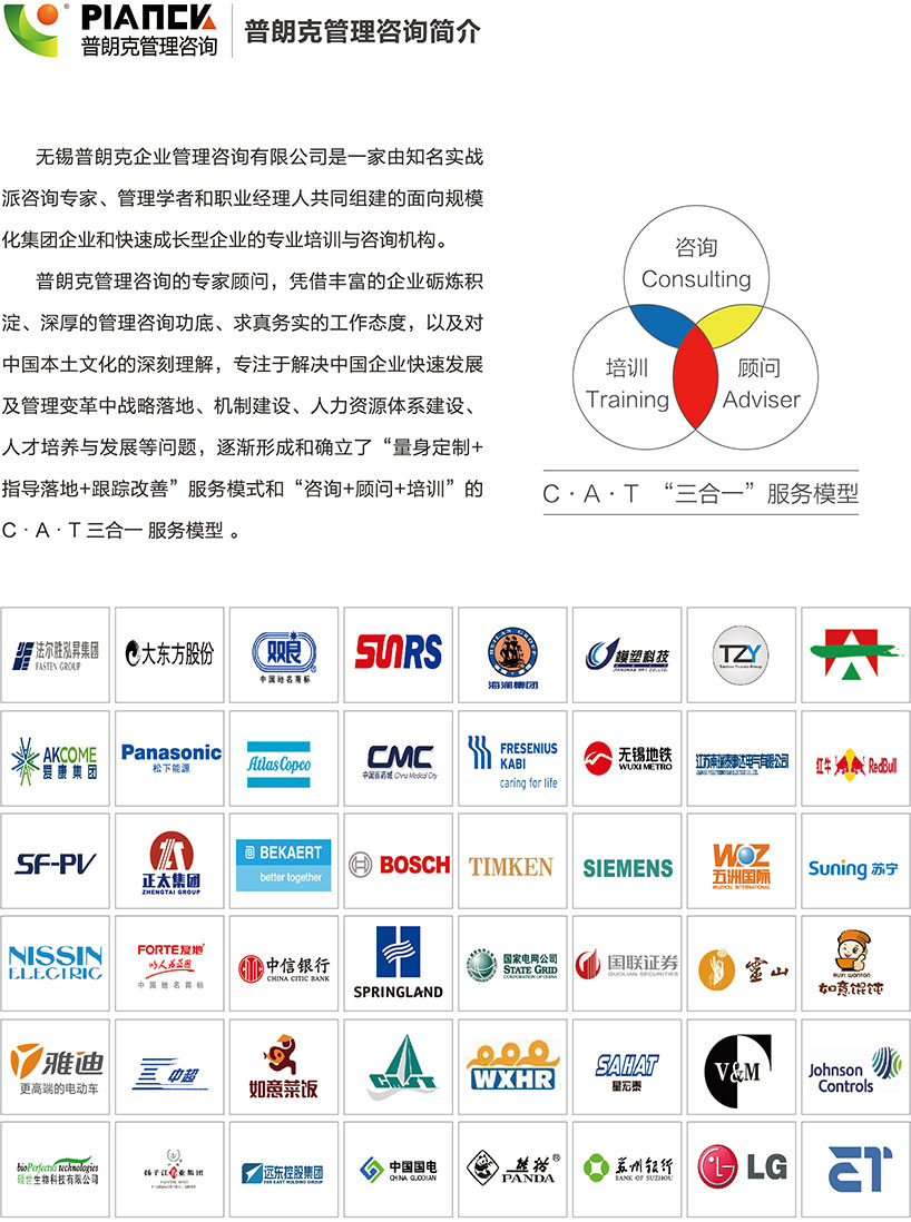 無錫普朗克企業(yè)管理咨詢有限公司是一家由知名實戰(zhàn)派咨詢專家、管理學者和職業(yè)經(jīng)理人共同組建的面向規(guī)?;瘓F企業(yè)和快速成長型企業(yè)的專業(yè)培訓與咨詢機構。